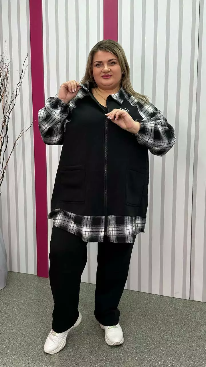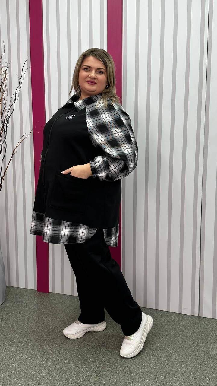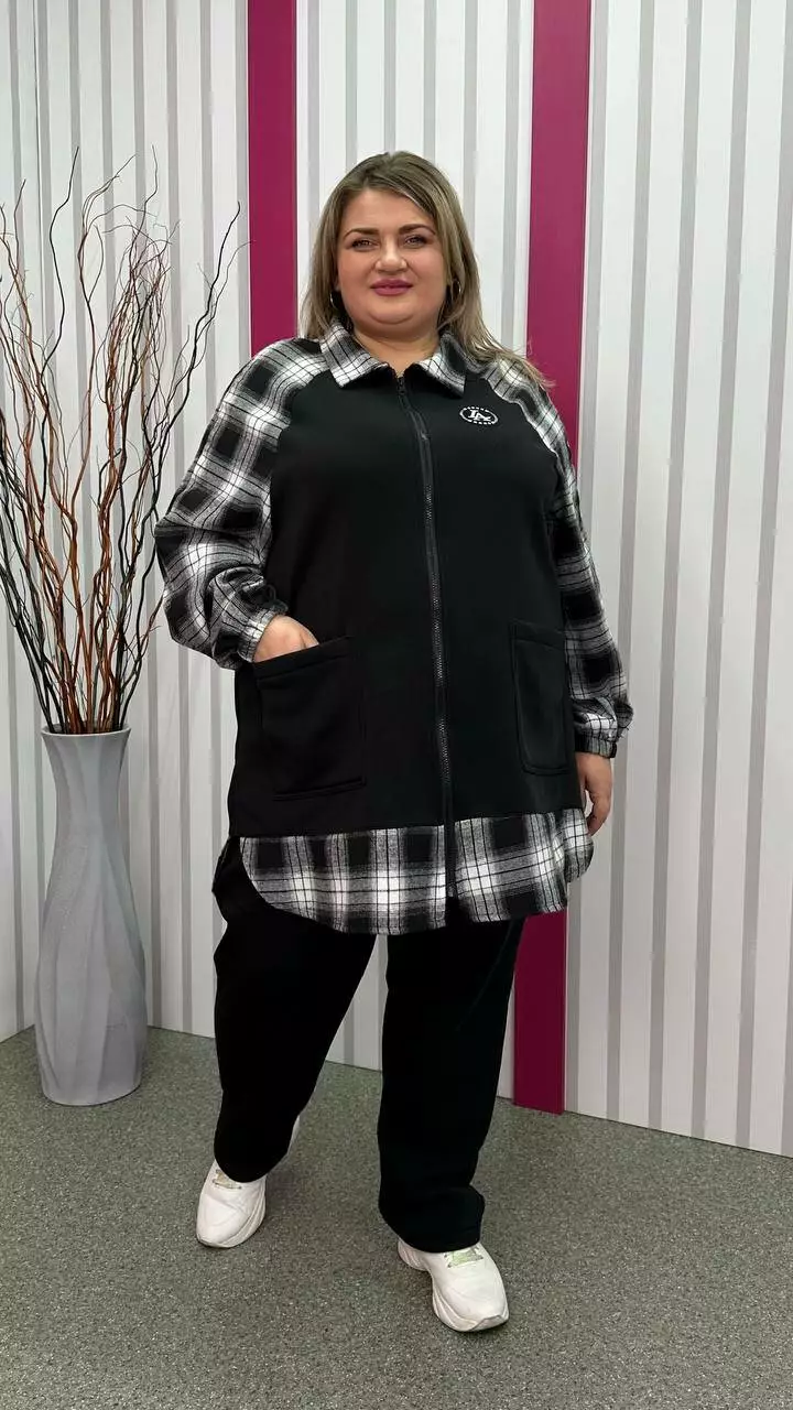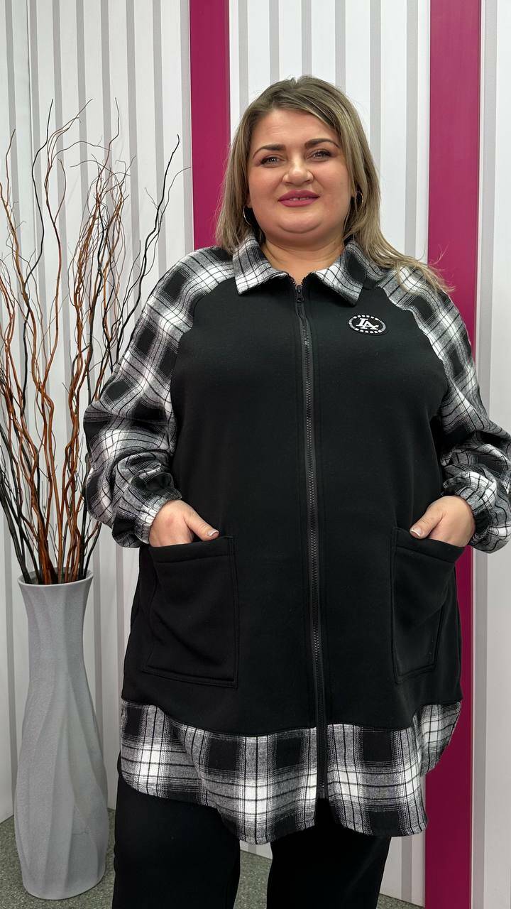 Тепла трикотажна толстовка з тринитки з начосом комбінована з сорочковою тканиною Силует трапеція Дві накладні кишені Застібка блискавка Манжет рукава на резинці Тканина м'яка, приємна до тіла, тягнеться