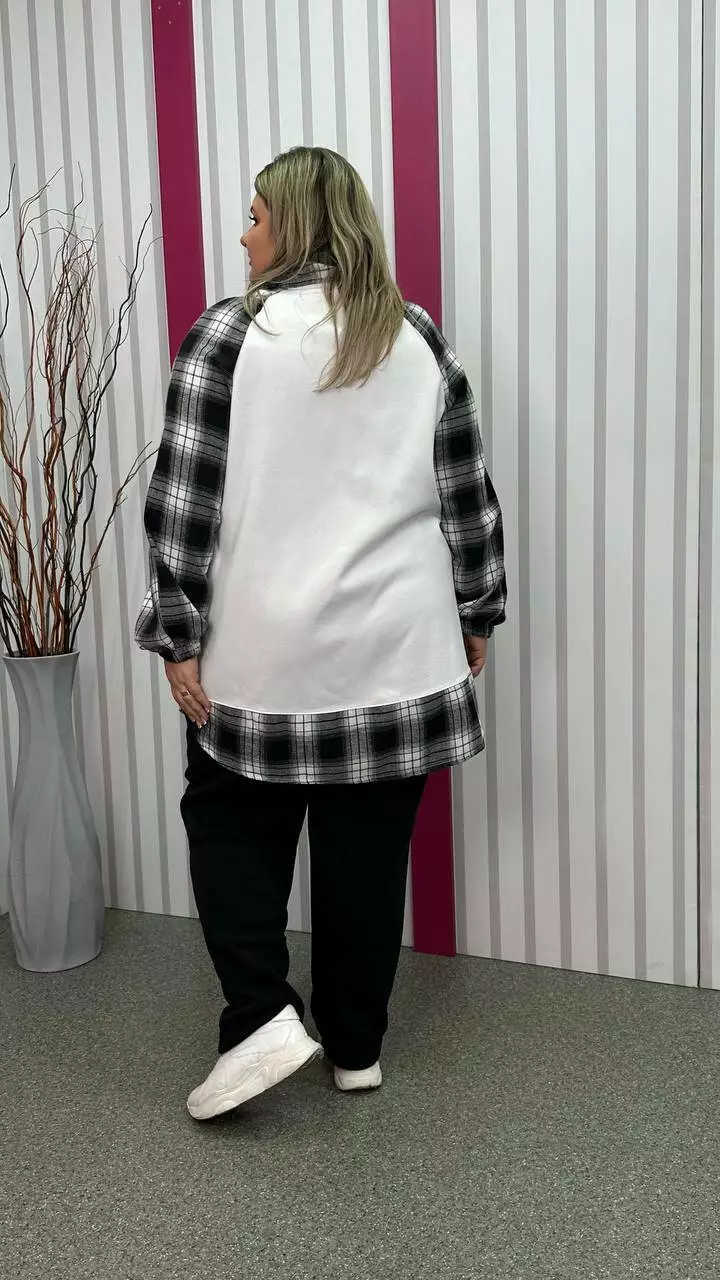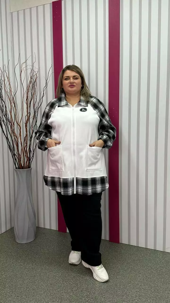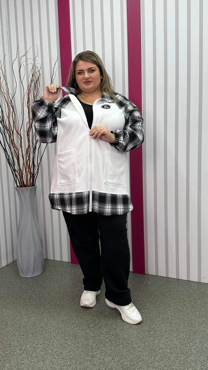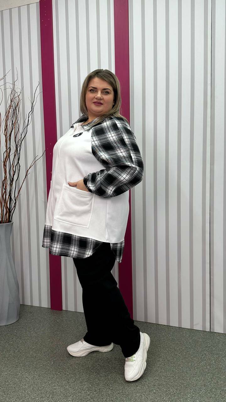 Тепла трикотажна толстовка з тринитки з начосом комбінована з сорочковою тканиною Силует трапеція Дві накладні кишені Застібка блискавка Манжет рукава на резинці Тканина м'яка, приємна до тіла, тягнеться