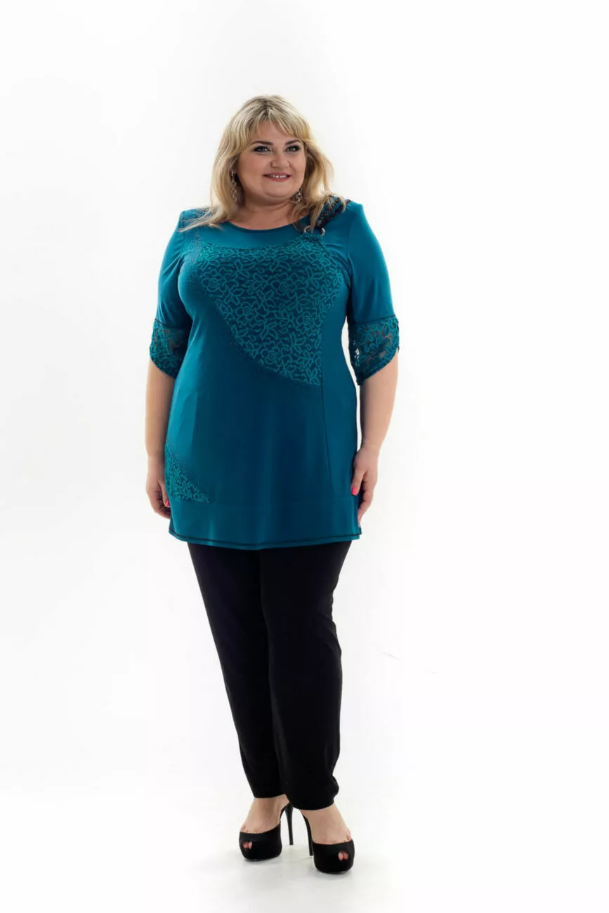 Тканина: олія 70% поліестер; 20% віскоза; 10% еластан. Красива туніка великих розмірів Джейн виконана з тканини масло, прикрашена вставками з дорогого гіпюру. Тканина якісна, міцна в носінні не вимагає особливого догляду.