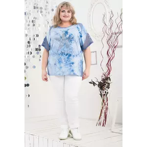 Тканина: штапель - 100% віскоза. Красива, літня, легка туніка вільного силуету. Рукав короткий, горловина кругла. Виріб прикрашений сіткою та накаткою зі страз.