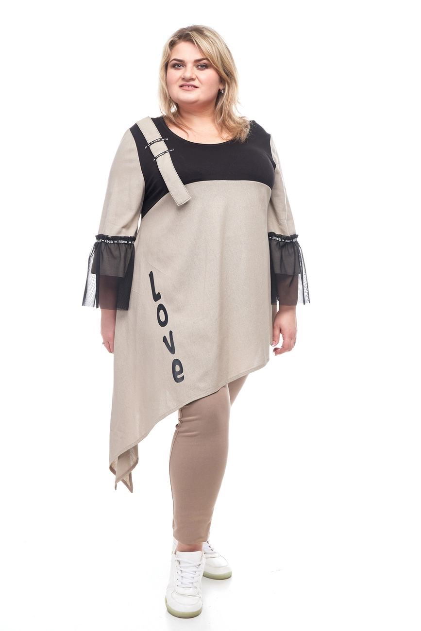 Тканина: льон -100% льон, віскоза-95% віскоза; 5% еластан. Стильна туніка напівприлеглого силуету; рукав – 3/4 доповнений сіткою; горловина кругла. Низ виробу асиметричний - подовжений з одного боку. Туніка виконана з тканини льон, поличка виконана з тканини віскоза. Виріб прикрашений накаткою літер та лямкою на одне плече.