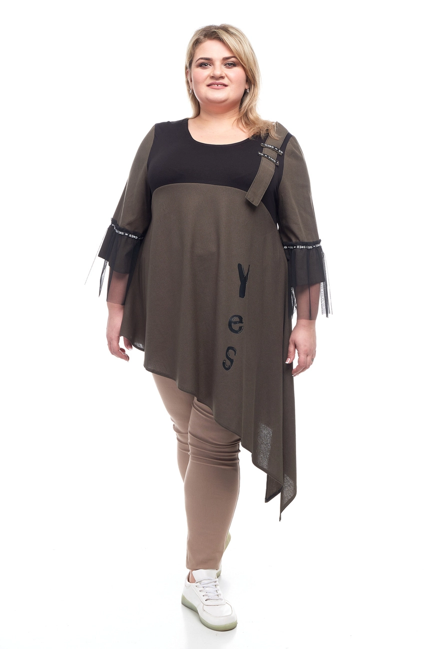 Тканина: льон -100% льон, віскоза-95% віскоза; 5% еластан. Стильна туніка напівприлеглого силуету; рукав – 3/4 доповнений сіткою; горловина кругла. Низ виробу асиметричний - подовжений з одного боку. Туніка виконана з тканини льон, поличка виконана з тканини віскоза. Виріб прикрашений накаткою літер та лямкою на одне плече.