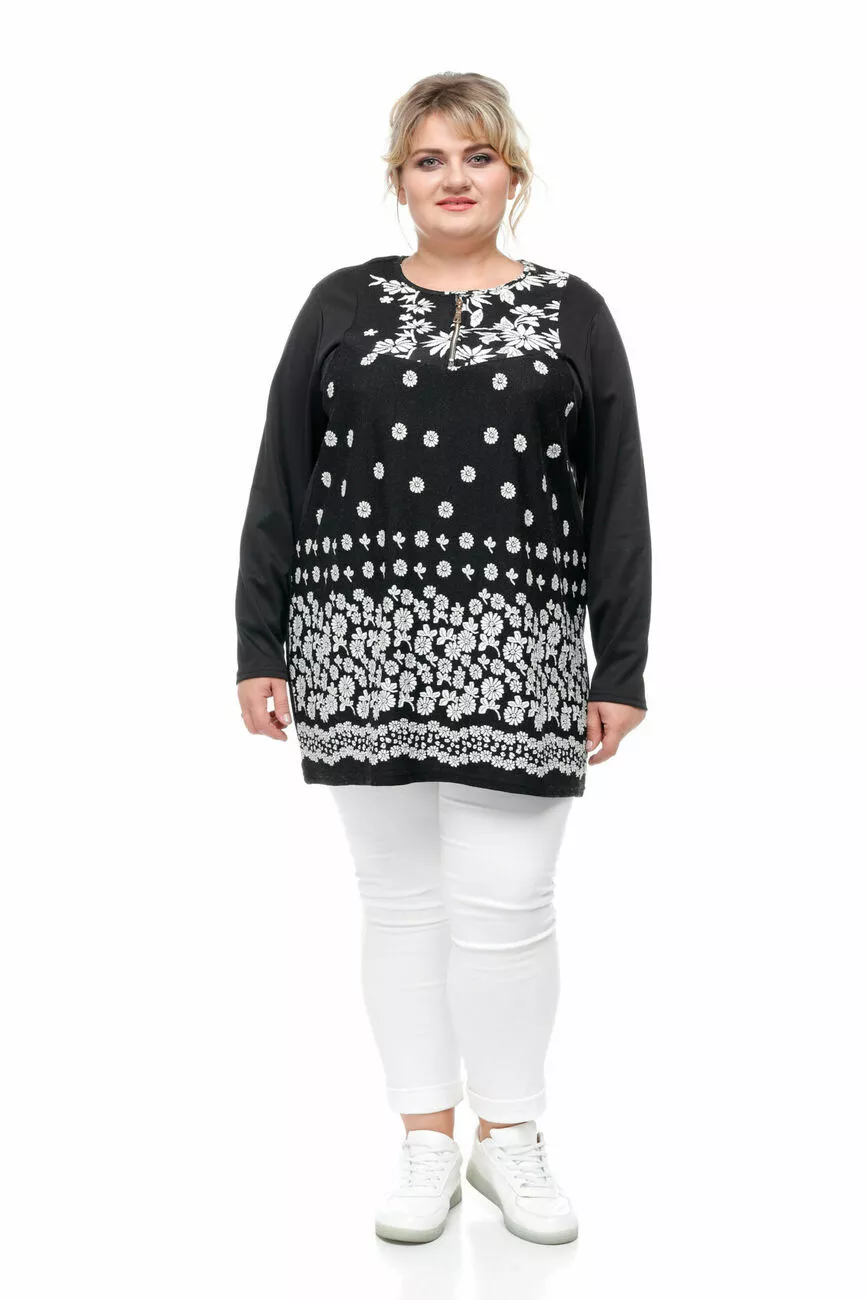 Тканина: жакард -100% поліестер. Туніка прямого силуету з довгим рукавом та красивим принтом ромашки. Тканина жакард, оздоблення французький трикотаж внизу видавлений принт. Горловина кругла. На лицьовій частині виробу декоративна блискавка для оздоблення.