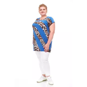 Тканина олія: 70% віскоза; 30% поліестер. Красива, літня туніка напівприлеглого силуету. Рукав короткий-реглан, горлоаїна кругла, на одному плечі аплікація зі страз.