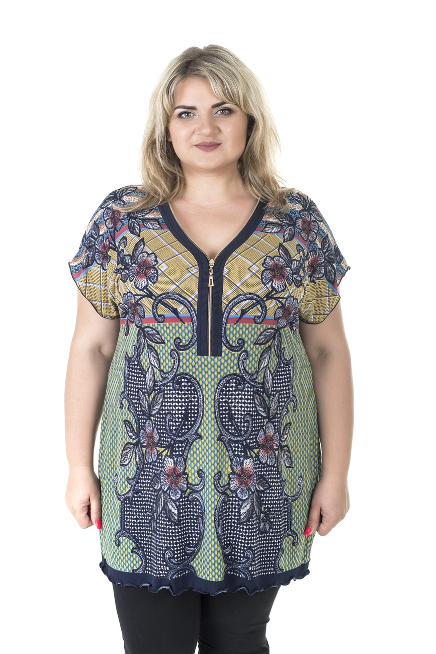 Тканина: олія -70% поліесте, 20% віскоза, 10% еластан. Стильна туніка напівприлеглого силуету. Рукав короткий, горловини на функціональні змійки. Тканина вищої якості, добре тягнеться, міцна, не потребує особливого догляду.