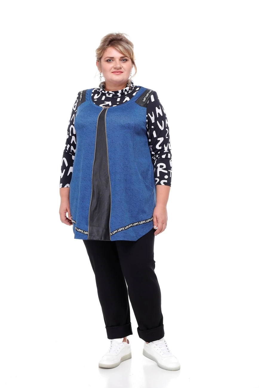 Тканина: французький трикотаж - 77% поліестер; 18% віскозу; 5% спандекс.Туніка виготовлена з тканини французький трикотаж, імітація двійки. Виріб вільного силуету, рукав довгий, горловина кругла хомутом. Низ туніки фігурний. Тканина м'яка, приємна на дотик.