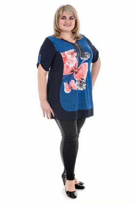 Тканина: масло-70% поліестер; 20% віскоза; 10% еластан. Стильна туніка напівприлеглого силуету. Рукав короткий, з хлястиком. Біля горловини блискавка, малюнок виробу прикрашений стразами. Тканина добре розтяжна, не потребує особливого догляду. Розміри :