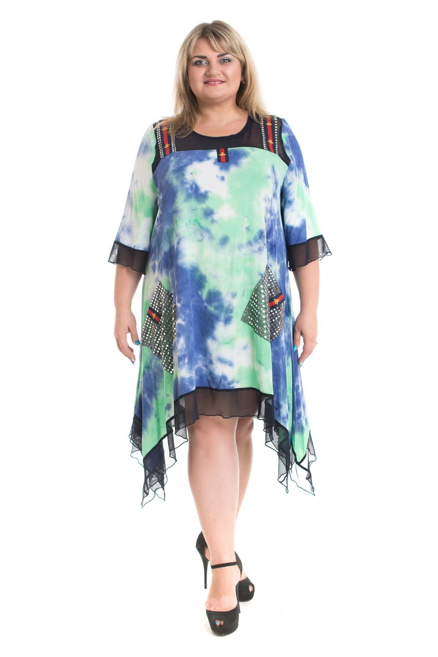 Тканина : штапель -100% віскоза. Модна, легка сукня вільного силуету. Низ виробу асиметричний з мереживом. Рукав короткий, горловина кругла. Виріб прикрашений кишенями та пряжками на плечах із металевих заклепок. Тканина еластична, не вимагає особливого догляду. Розміри : 60-64 ог-128 от-132 об-180 дв-95; 66-70 ог-136 от-140 об-188 дв-95.