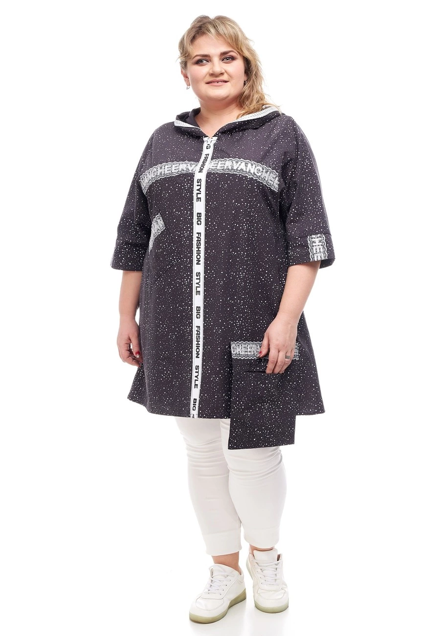 Тканина: сорочка-90% бавовна; 10% поліестер. Стильна, модна туніка виготовлена з сорочкової тканини. Виріб на змійці з капюшоном, рукав 3/4. Туніка прикрашена буквеними нашивками з мереживом, а також накладною кишенею. Тканина гарної якості, не вимагає особливого догляду.