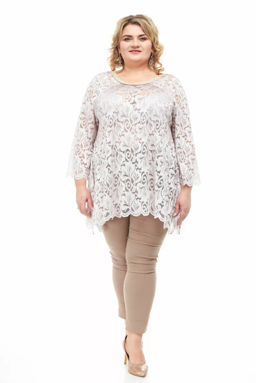 Тканина: гіпюр-57% поліестер; 40% нейлон; 3% еластан. Ошатна та красива туніка з гіпюру, виконана в стилі oversize. Рукав довгий, широкий; горловина кругла. Низ виробу широкий, подовжений з боків. Висока повітропроникність, гіпоалергенність, низька змінність, добре тягнеться. Догляд: рекомендується ручне прання, температура води не вище 40 градусів. Прасувати не потрібно, але при необхідності температура праски не може 150 градусів і через марлю.