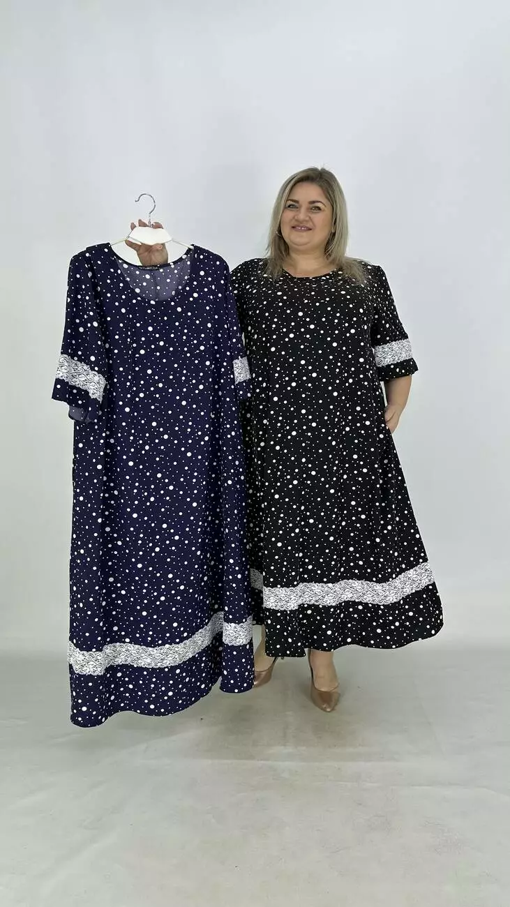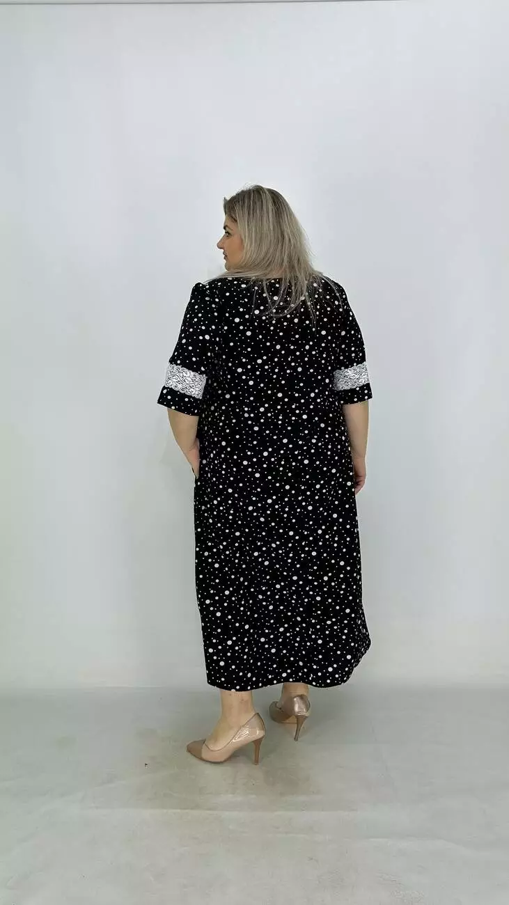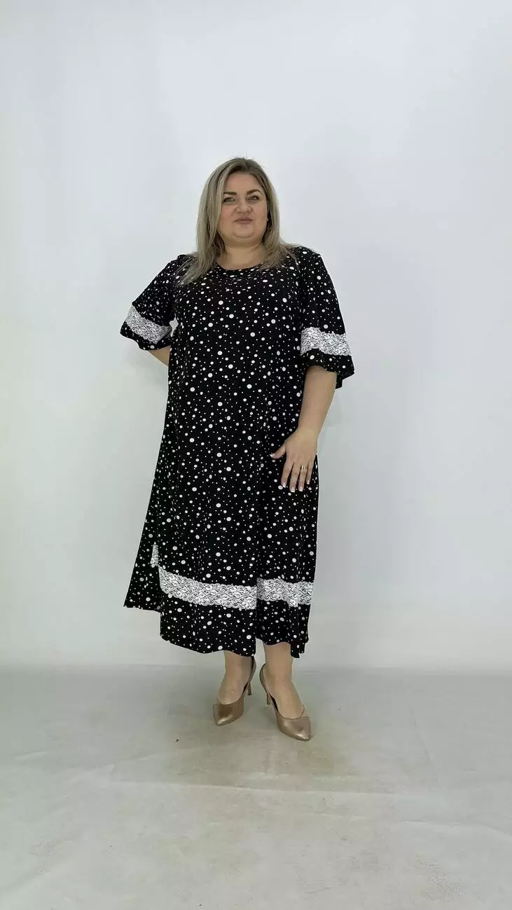 Свободное платье из супер софта, ткань лёгкая, мягкая, не мнется, растяжимости нет. А-образный силует, карманы в боковых швах. Платье украшено кружевом, рукав расширен.