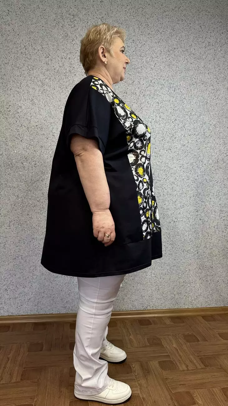 Вільна подовжена туніка з дуже якісного турецького кулера, спів-компакт. Силует вільний, по грудях оверсайз. Прикрашена кольоровими вставками та якісним накатом. Тканина – бавовна з еластаном, гарна розтяжність, не кашлатиться, не витягується.