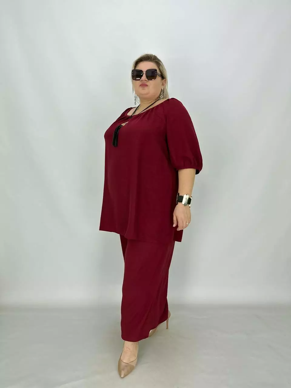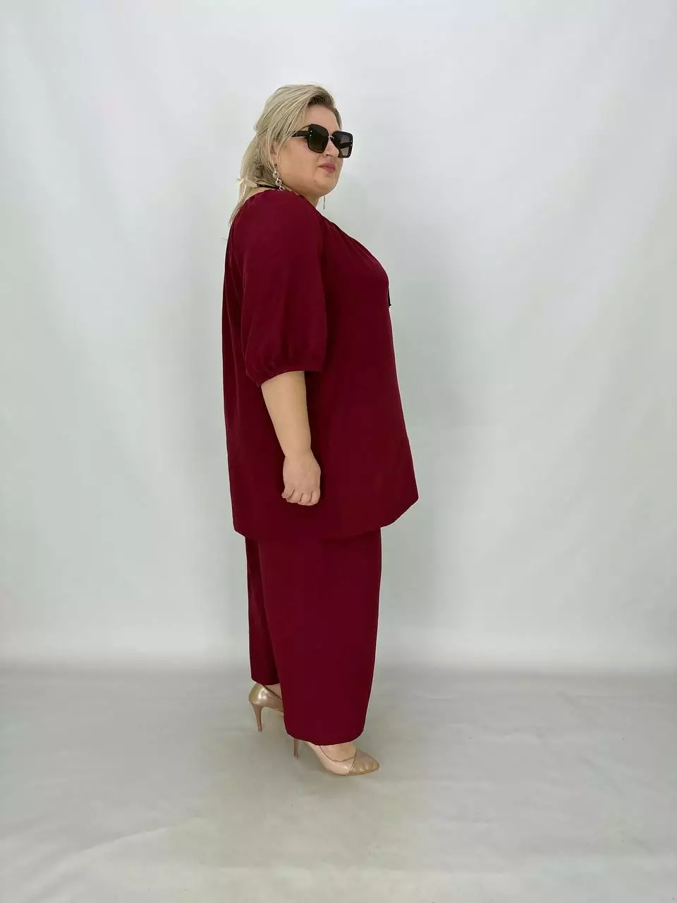 Тканина-американський креп, трохи тягнеться, невагома, не світиться, не потребує особливого догляду.