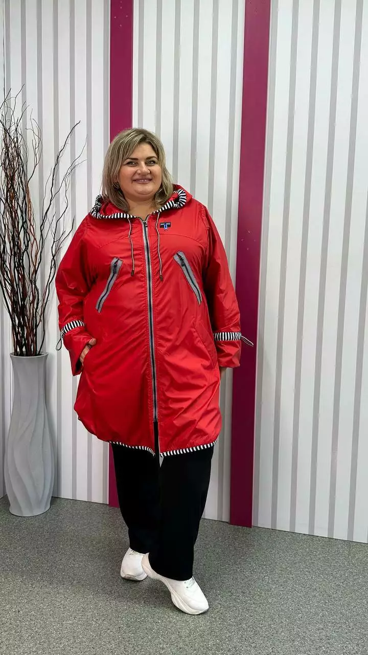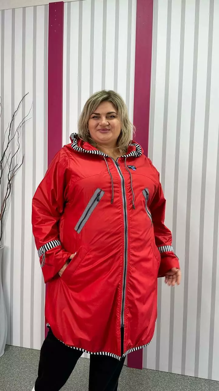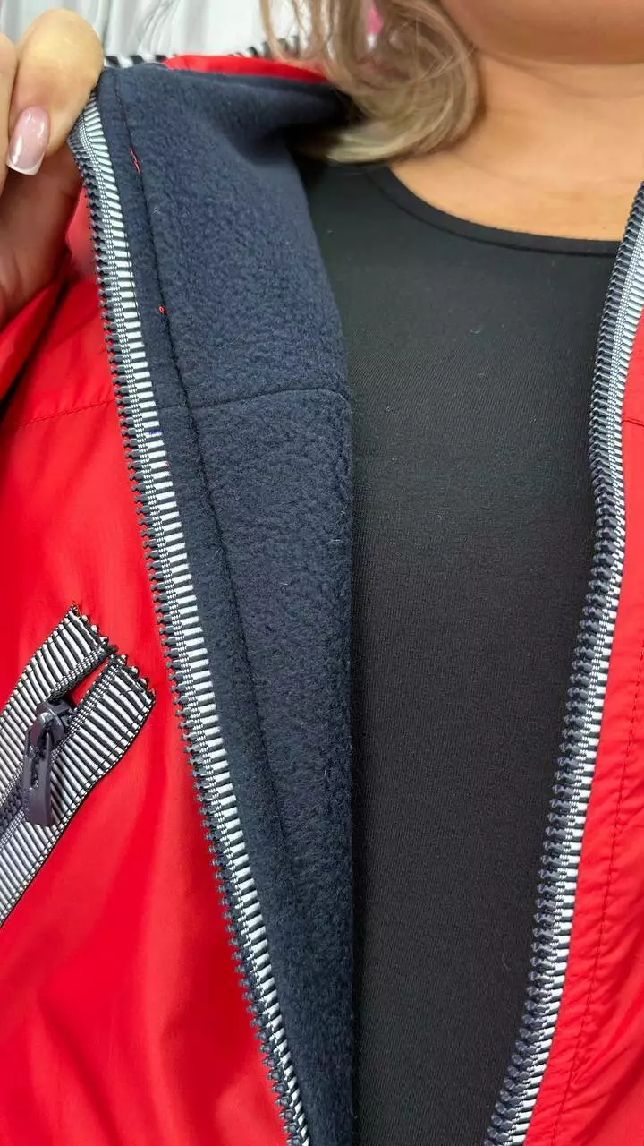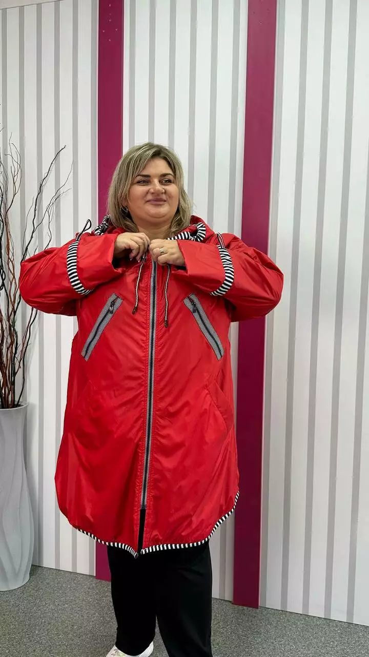 Вітровка на флісі з турецької плащової тканини "лаку" - не промокає, не продувається, м'яка, дуже комфортна. Підкладка-якісний фліс, рукав вшитий окремо, тому підкладка не тягне за одягом, дуже комфортна в носінні. Фасон вільний, по грудях оверсайз, рукав зі спущеною проймою до талії, широкий, в районі пензля ширина регулюється шнурком. З об'ємним капюшоном, кишеня листочка. Якісна турецька змійка в смужку та оздоблення в смужку надають виробу шикарного вигляду.