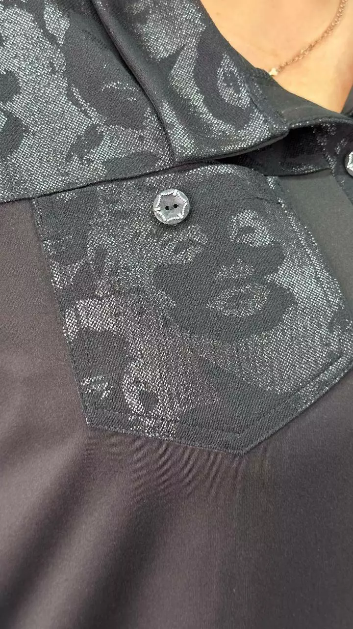 Туніка-сорочка з трикотажу мікродайвінг на флісі середньої щільності з гарною розтяжністю, дуже м'яка і приємна до тіла. Силует вільний А-подібний, спущене плече, рукав довгий. Планка декоративна не розтігується. На грудях дві функціональні кишені. Підійде як на кожен день, так і на вихід.