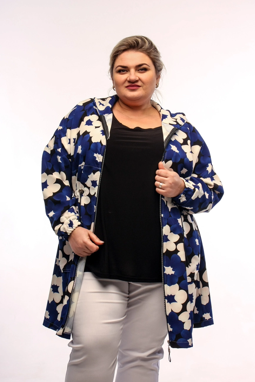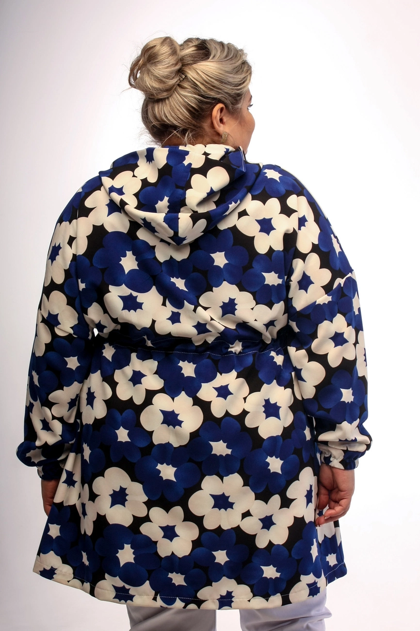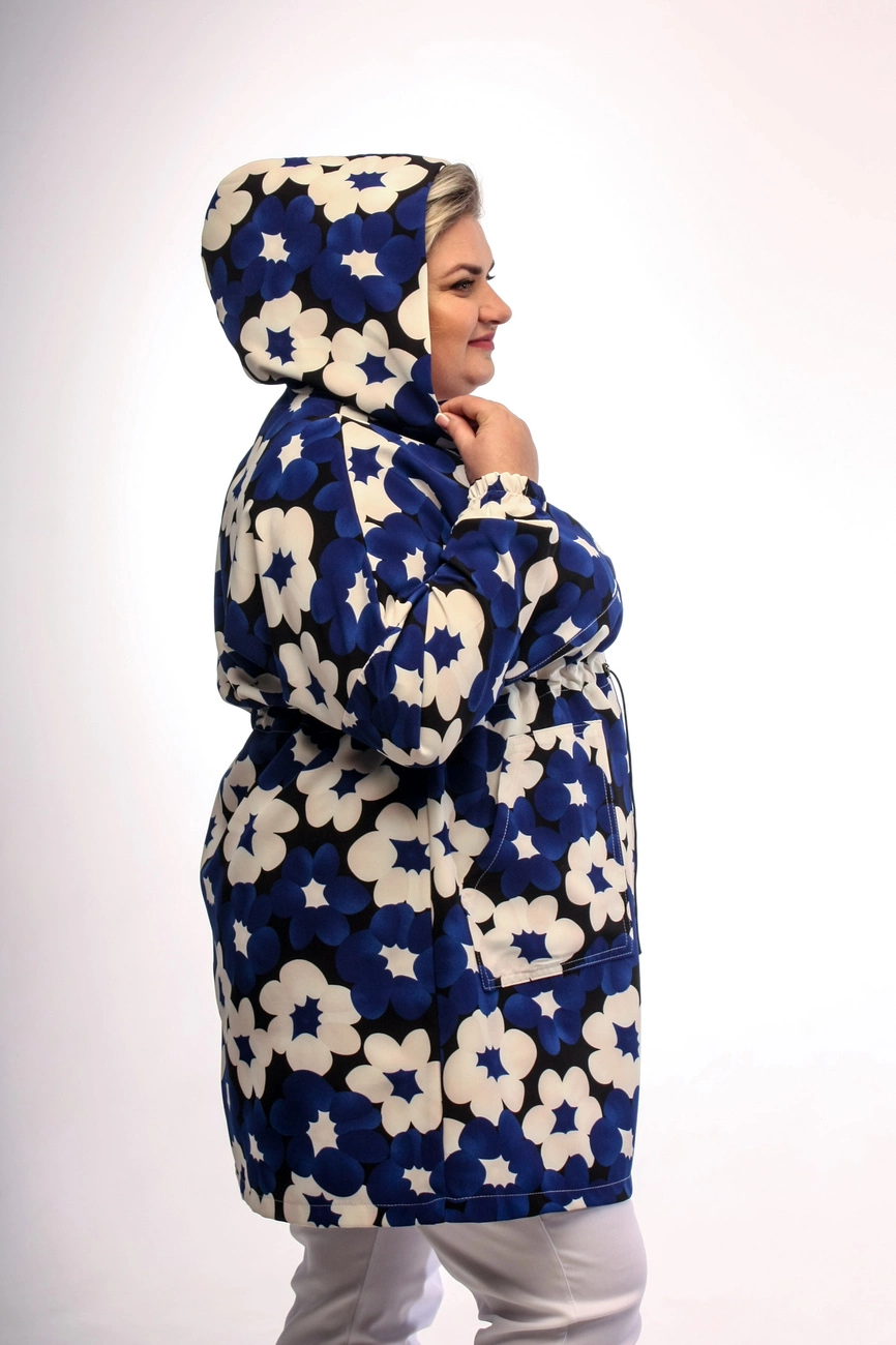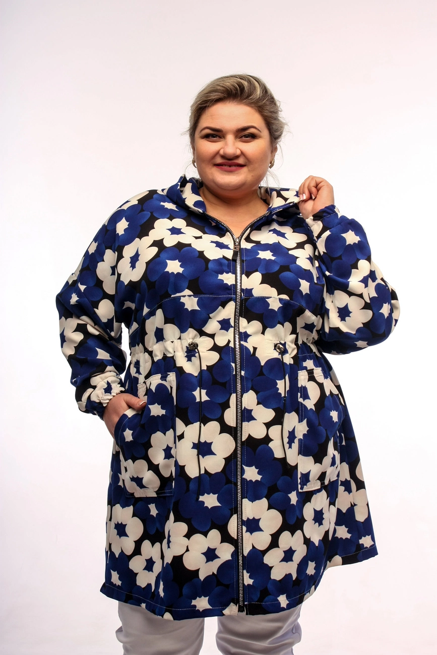 втягненою гумкою в куліску, кишені накладні, капюшон, манжети на